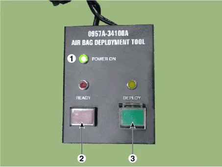 (2)Press and hold READY (2) until it is on, and then press DEPLOY (3) to deploy the airbag.