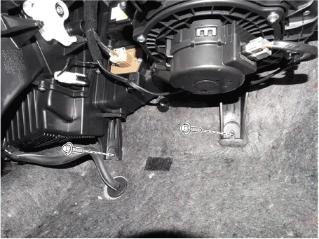 29.Remove the heater and blower unit from the crash pad after loosening the mounting nuts.