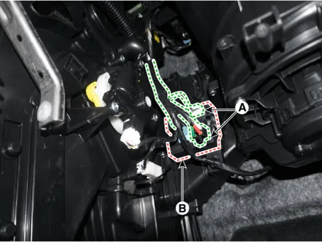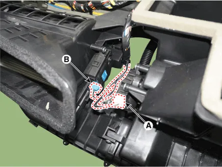 (2)Disconnect the auto defogging actuator connector (A) and intake actuator connector (B) remove the wiring mounting clips.