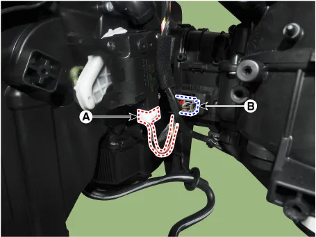 2.Disconnect the blower motor connector (A) and then remove the blower motor (B) after loosening the screws.