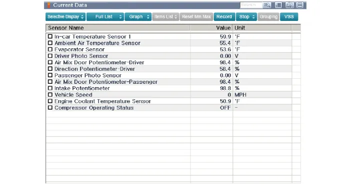 1.The heating, ventilation and air conditioning can be quickly diagnosed failed parts with vehicle diagnostic system (GDS).※ The diagnostic system (GDS) provides the following information.(1) Self diagnosis : Checking the failure code (DTC) and display.(2) Current data : Checking the system input / output data state.(3) Actuation test : Checking the system operation condition.(4) Additional function : Other controlling such as he system option and zero point adjustment.