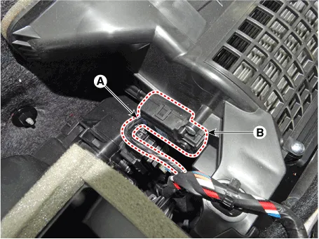2.Disconnect the connector (A) and then remove the PWM Blower module (B) after loosening the mounting screws.