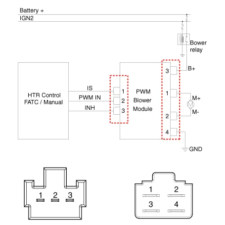 2.Manually operate the control switch and measure the voltage of the blower motor.