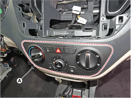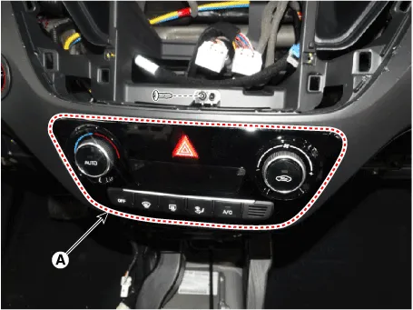 9.After loosening the mounting screws, remove the A/C & heater controller unit (A).