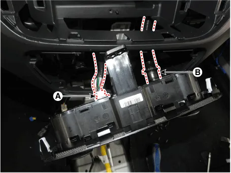 5.Disconnect the A/C & heater controller connector (A) and hose (B).
