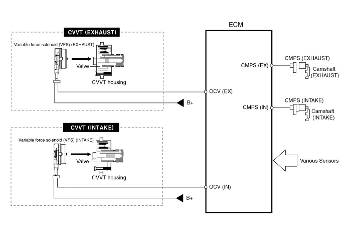 – the CVVT Oil Control Valve (OCV) which supplies the engine oil to the cam phaser or runs out the engine oil from the cam phaser in accordance with the ECM PWM (Pulse With Modulation) control signal,