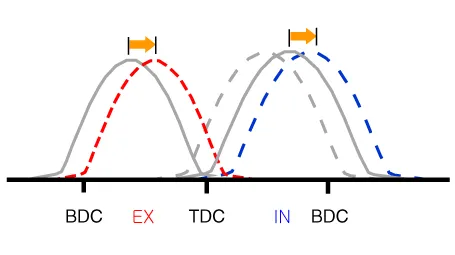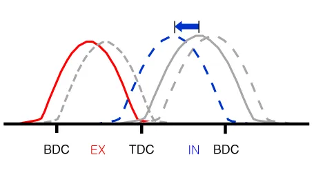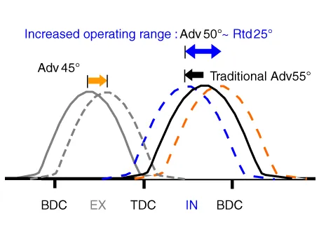 | (3) Low Speed /High Load | Retard | * Increase of expansion work | Advance | * Prevention of intake back flow (Improvement of volumetric efficiency) |