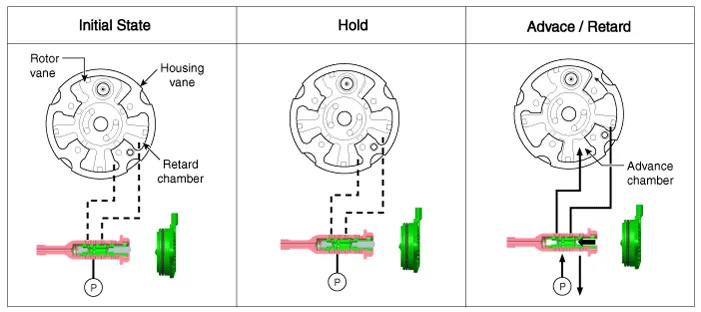 The engine oil getting out of the CVVT oil control valve varies the cam phase in the direction (Intake Advance/Exhaust Retard) or opposite direction (Intake Retard/Exhaust Advance) of the engine rotation by rotating the rotor connected with the camshaft inside the cam phaser.