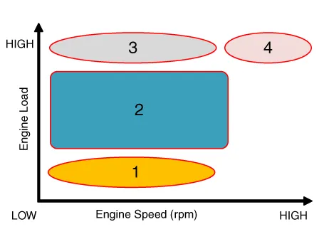 | (3) Low Speed / High Load | (4) High Speed / High Load |