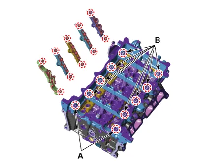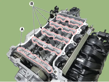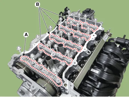 (1)Install the camshaft front bearing cap (A) and camshaft bearing caps (B).