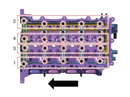 • If there is enough engine oil on the camshaft front bearing cap and camshaft bearing cap installing bolt and bolt hole, tighten to the minimum required tightening torque.