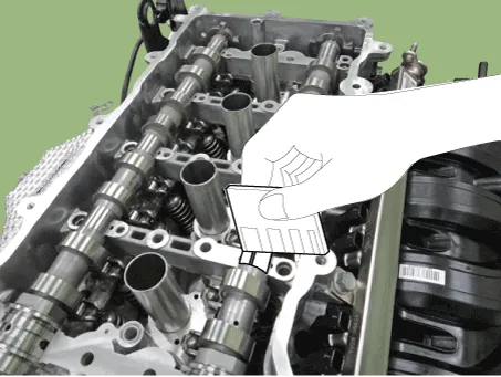 • Apply engine oil the upper part of the intake / exhaust camshaft journal, then install the camshaft front bearing cap and camshaft bearing cap. The amount of application should be enough to flow down both the front and back sides when it is applied to the center.