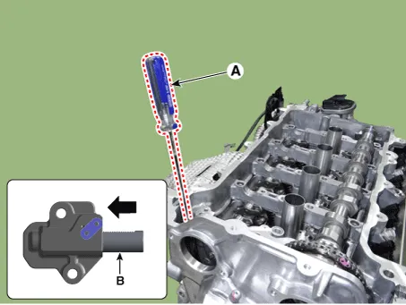 (1)With a pry bar (A), compress the timing chain tensioner piston (B).