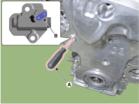 12.Release the lock by putting down rachet plate (B) of timing chain tensioner with using back of tiny awl (A).