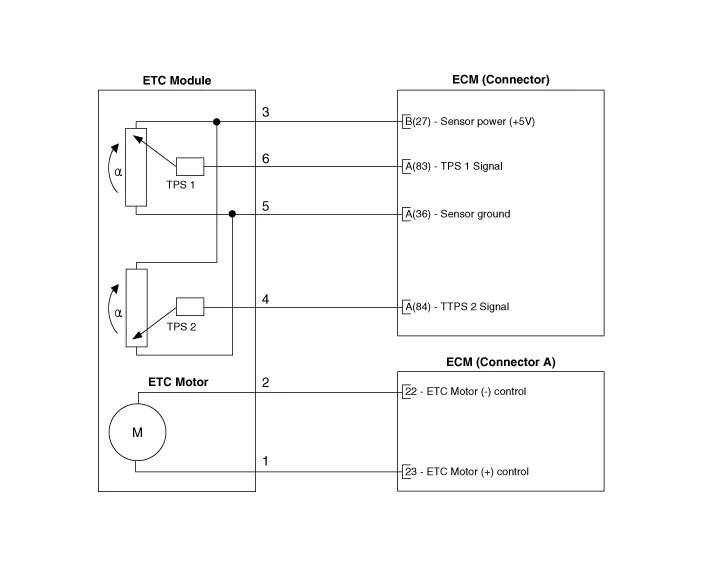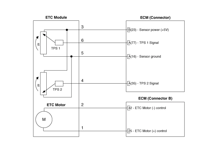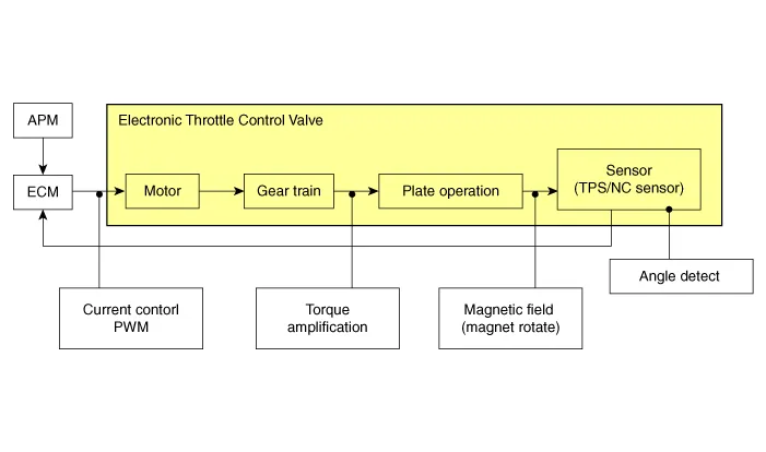 - Description The Electronic Throttle Control (ETC) System consists of a throttle body with an integrated control motor and throttle position sensor (TPS). Instead of the traditional throttle cable, an Accelerator Position Sensor (APS) is used to receive driver input. The ECM uses the APS signal to calculate the target throttle angle; the position of the throttle is then adjusted via ECM control of the ETC motor. The TPS signal is used to provide feedback regarding throttle position to the ECM. Using ETC, precise control over throttle position is possible; the need for external cruise control modules/cables is eliminated.