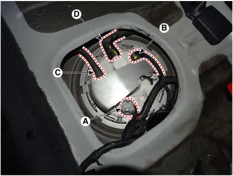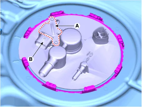 8.Release the lever (A), and then separate the canister close valve (B) from the fuel tank air filter after rotating it in the direction of the arrow in the figure.