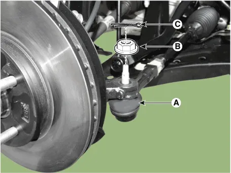5.Loosen the lower arm nut (A) and then remove the lower arm ball joint by using SST(09568-1S100).