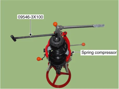 • When compressing the coil spring, be cautious as there may be corrosion due to damage to the coil spring painting. In order to avoid such painting damage, compress by putting over the waste hose, etc. (Refer to the picture below.)