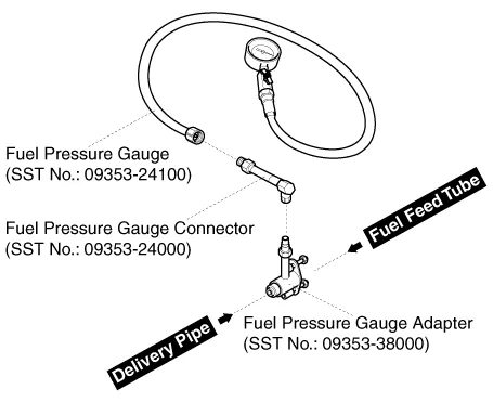 3. Inspect fuel leakage on connections among the fuel feed tube, the delivery pipe, and the SST components with IG ON.