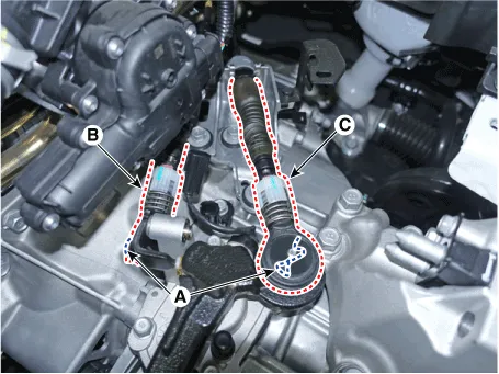 1)Remove the snap pin (A) and then separate the select cable (B) and shift cable (C).