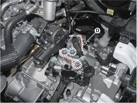 2) Loosen the mounting bolts and then removing the control cable bracket (D).