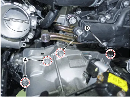 10.Loosen the starter mounting bolts (A) and the transaxle upper mounting bolts (B).