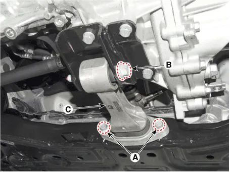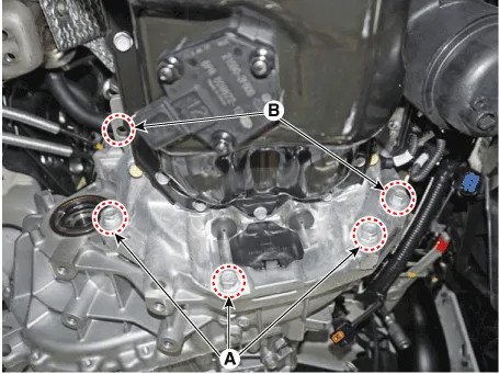 22.Loosen the lower mounting bolts (A) and (B) of lower part of the transaxle, and the left side cover and remove the transaxle assembly by supporting it with a jack.