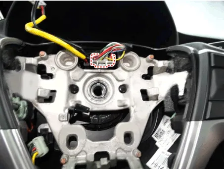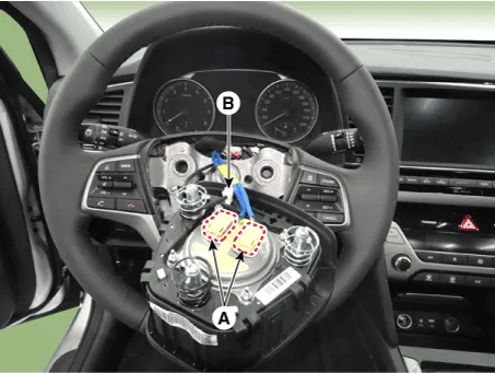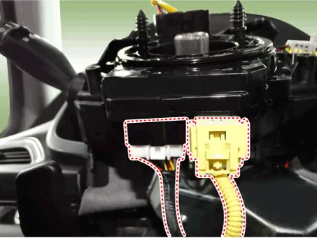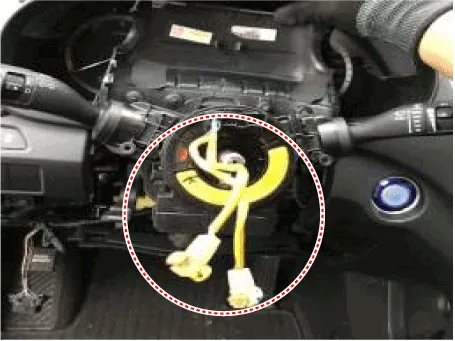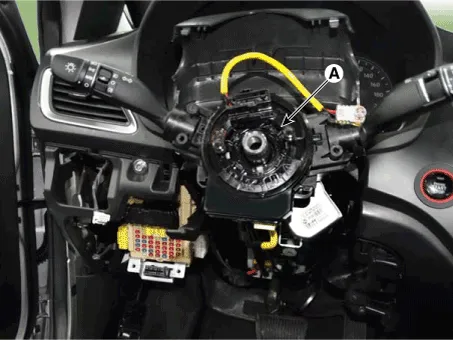 3.Turn a steering wheel anti-clockwise, so make a guide hole (A) shown on the rightside. Put a tool into a hole (A) and bend back a fixed DAB spring. Make sure to pull DAB cover when bend back the spring.