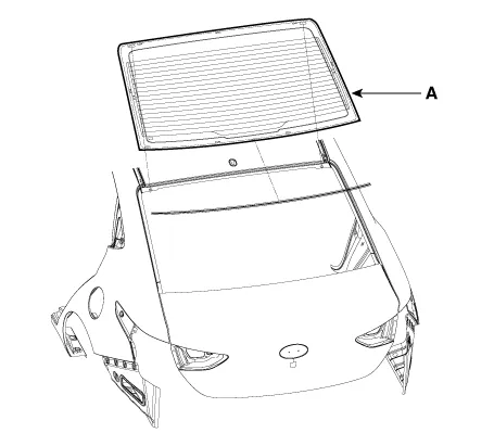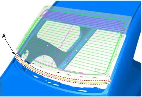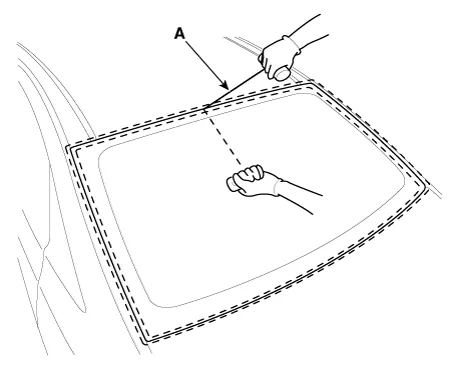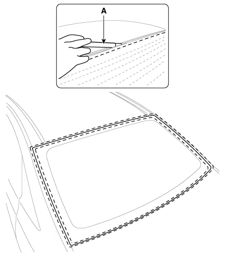 5.Peel off the tape from the rear window glass molding (A) and install the molding on the rear window glass.