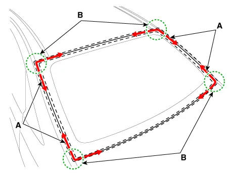 6.Pack adhesive into the cartridge without air pockets to ensure continuous delivery. Put the cartridge in a caulking gun, and run a bead of adhesive (B) around the edge of the rear window glass (A) between the fastener and molding as shown. Apply the adhesive within 30 minutes after applying the glass primer. Make a slightly thicker bead at each corner.