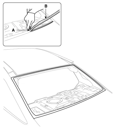 1.Remove the sealant (B) with a cutting knife (A) on the body panel.