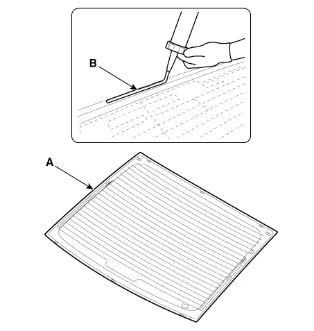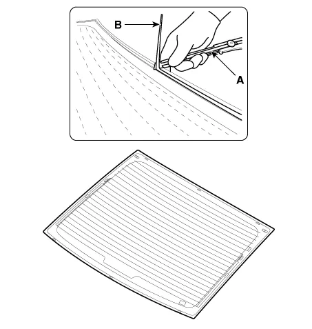 2.Remove the sealant (B) with a cutting knife (A) on the rear window glass.