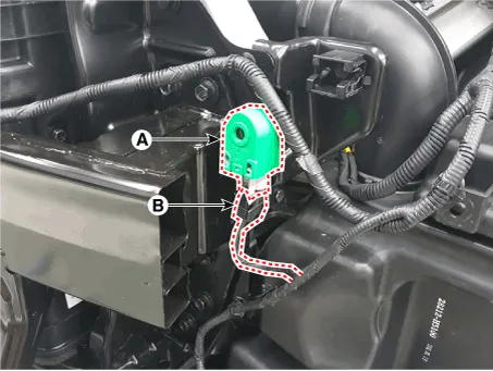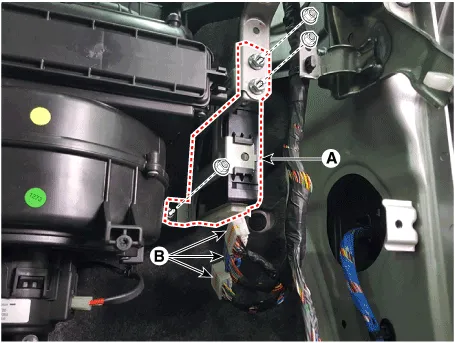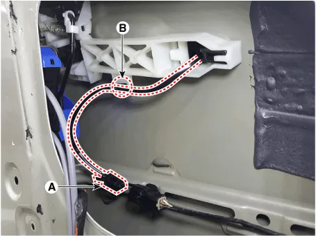 3.Disconnect the front door outside handle connector (A) and then remove the wiring mounting clip (B).