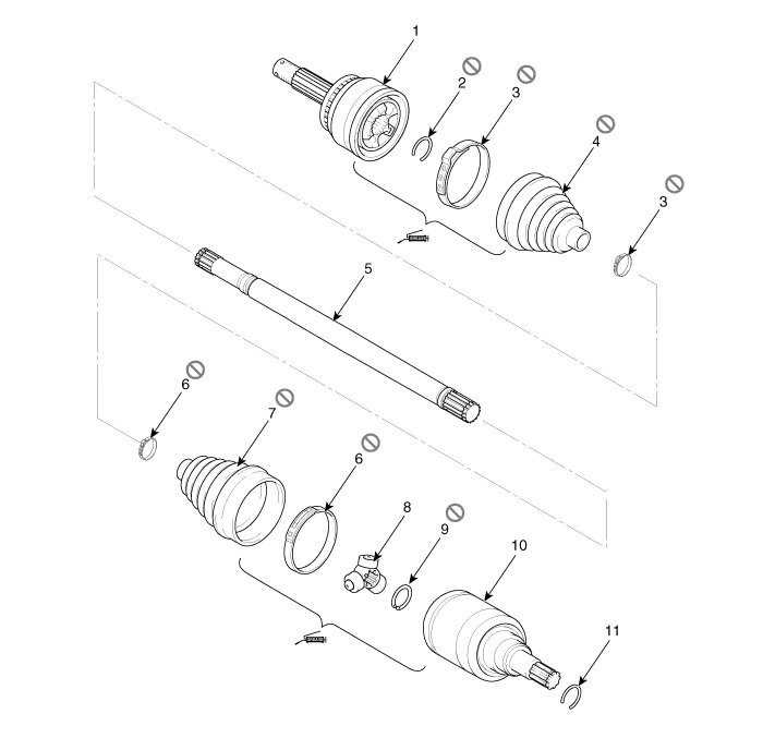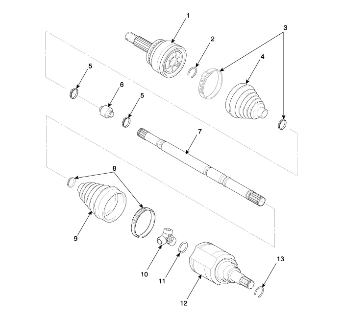• Do not pull the driveshaft by excessive force it may cause components inside the joint kit to dislodge resulting in a torn boot or a damaged bearing.