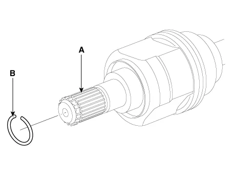 2.Remove the housing circlip (B) from the driveshaft spline (A).