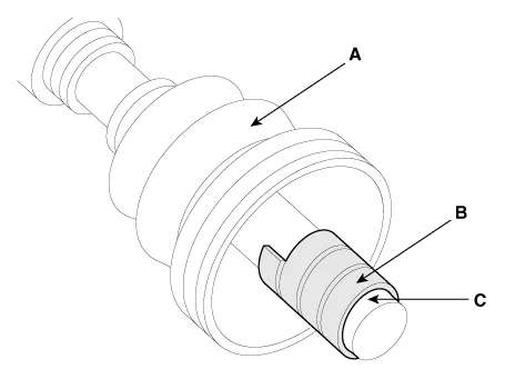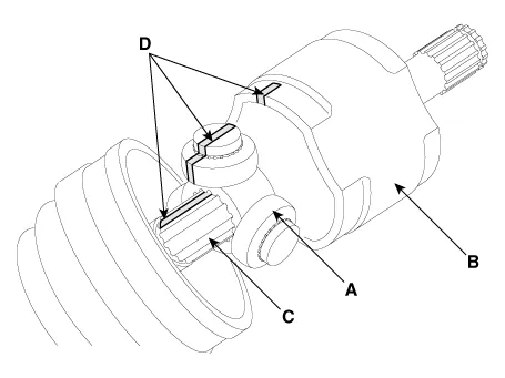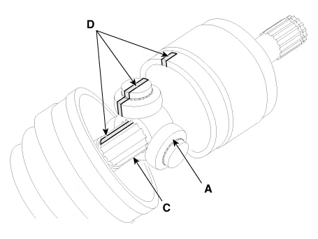 • Make alignment marks on spider roller assembly (A), joint case (B), and shaft spline (C) to aid reassembly.