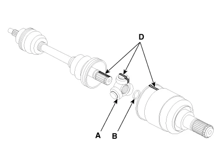 2.Using the alignment marks (D) made during disassembly as a guide, install the spider assembly (A) and snap ring (B) on the driveshaft splines (C).