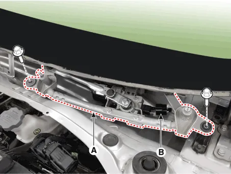 5.Remove the windshield wiper motor and linkage assembly (A) after loosening the bolts and disconnecting the wiper motor connector (B).