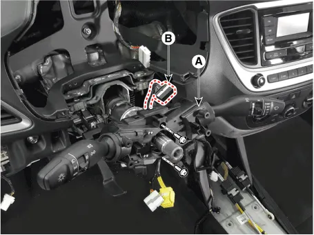 5.Remove the multifunction switch assembly (A) after loosening the screws and disconnecting the connector (B).